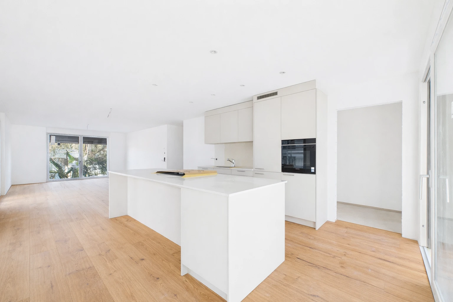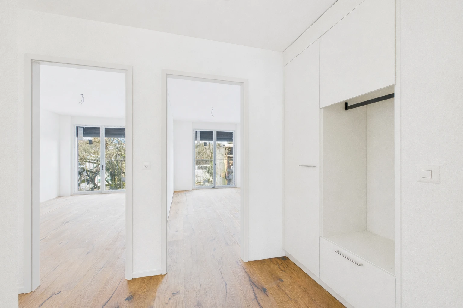 Diese exklusive Neubauwohnung befindet sich im 1. Obergeschoss eines modernen Wohngebäudes, das im Frühling 2026 fertiggestellt wird. Sie überzeugt durch einen hochwertigen Innenausbau sowie ein durchdachtes und grosszügiges Raumkonzept. Edler Eichenparkett verleiht sämtlichen Wohnräumen eine warme, zeitlose Eleganz und unterstreicht den gehobenen Anspruch der Liegenschaft. Im Eingangsbereich, im Korridor sowie im Küchenbereich sorgen stilvoll integrierte Deckenspots für eine angenehme und moderne Lichtstimmung.